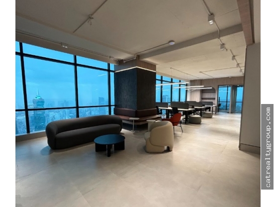 Se alquila oficina amoblada de lujo con diferentes divisiones privadas, sala de reuniones pública, cuenta con recepción, área de cocina, baño, estacionamiento, A/A, vista panorámica, área de estar y pequeño cubículo individual privado.