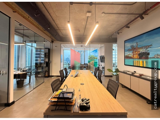 Costa del Este, Time Square oficina de 135m2 amoblado la mismo ofrece recepcion, sala de conferencias, open office con espacio para 6 personas, 3 oficinas cerradas con su mobiliario y sus ventanales piso a techo con su vista espectacular , 2 baños incluy ducha, cafeteria con area para comer y linea blanca, cuenta con sistema inteligente, aires, persianas, iluminacion, remodelacion moderna. incluye dos estacionamientos.